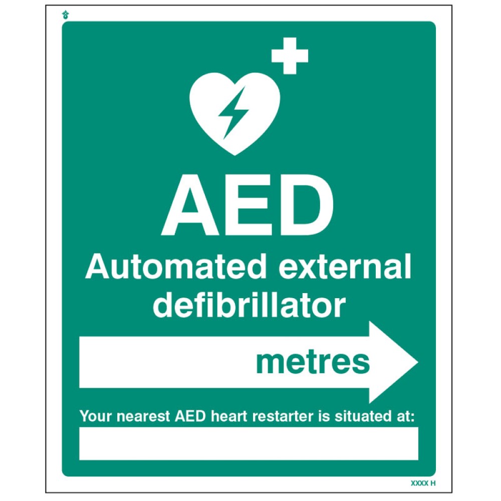 This AED (defibrillator) sign ensures staff, visitors and the general public know how far and which ..