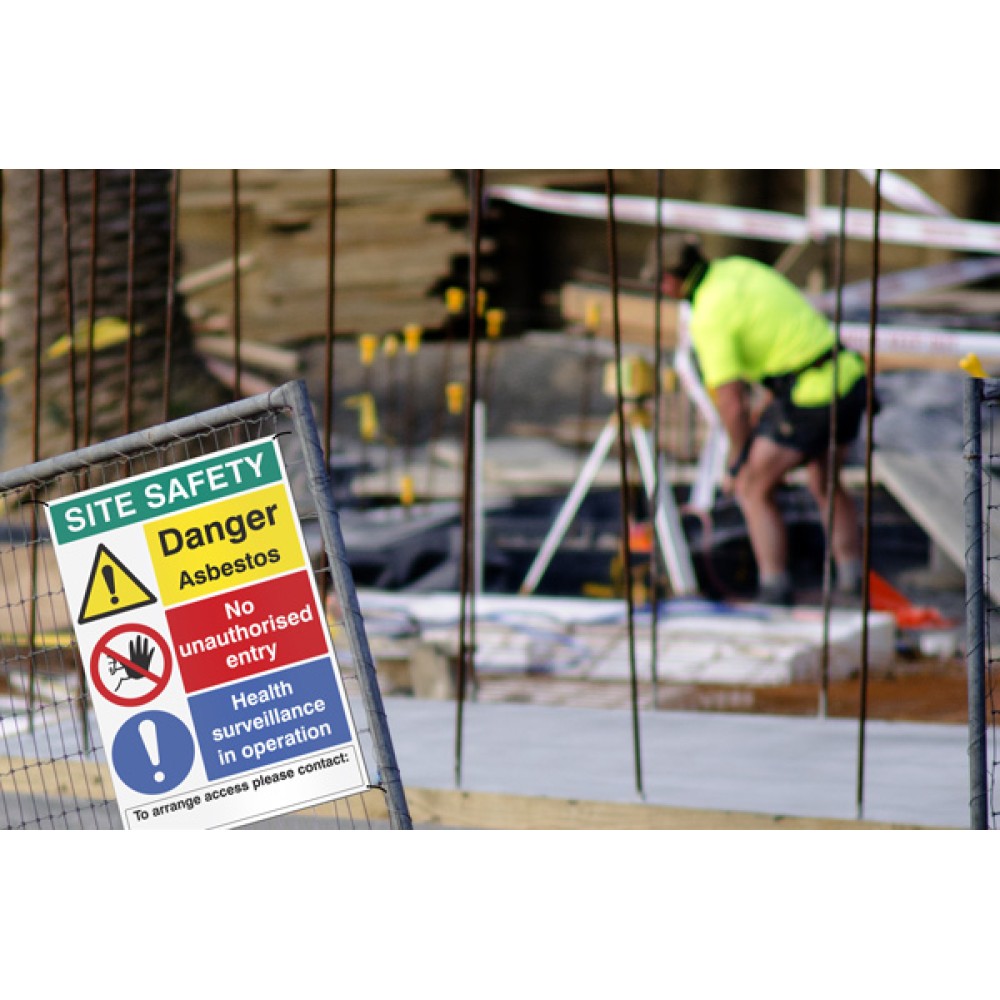 Multi-message signs provide multiple safety messages on one sign. This sign warns of the hazard and mandatory/prohibition action to be taken due to asbestos. You can write contact details in the space provided or we can print them on the sign for you - please state your required contact details when ordering