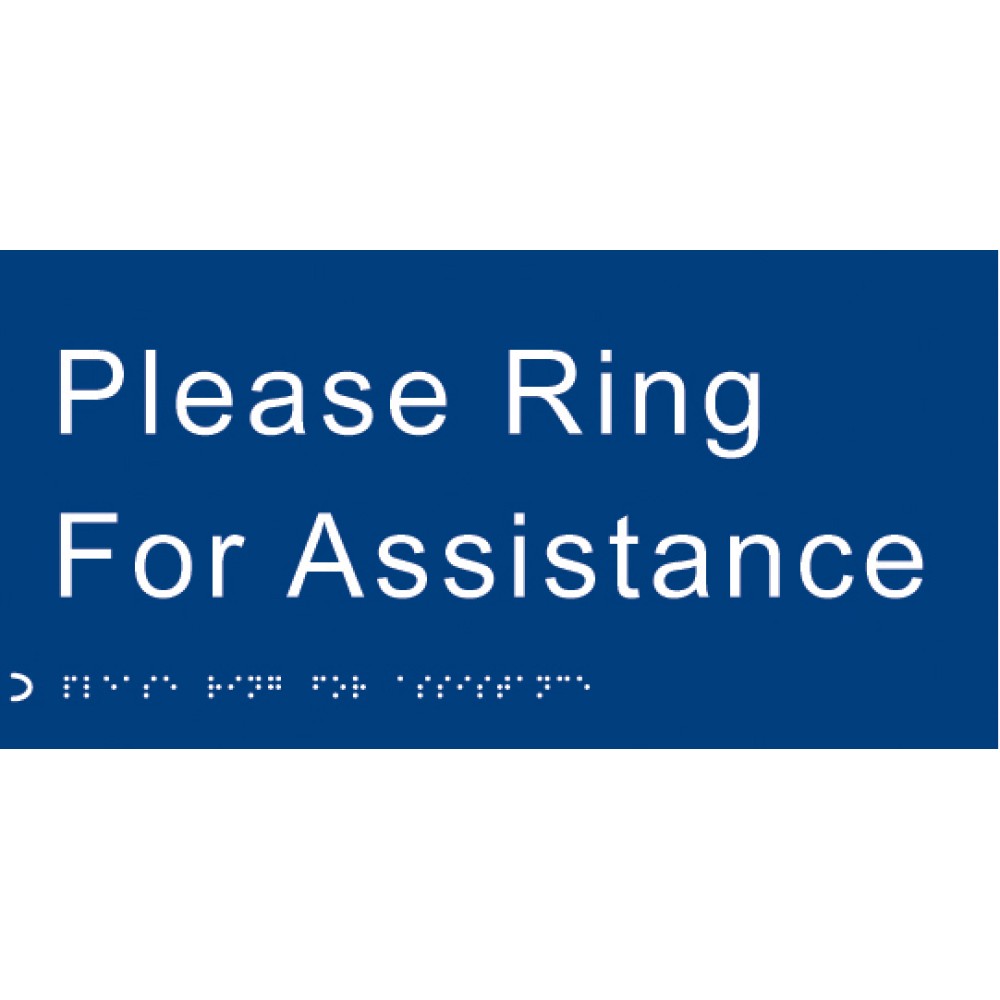 This braille please ring for assistance sign helps ensure people with visual impairment can locate alarms, bells etc. to notify staff. The raised letters, symbol and braille ensures our braille/tactile sign can be read by everyone. Designed to help you meet your obligations under the DDA and Equality Act 2010. Our braille signs have an adhesive backing for easy installation.