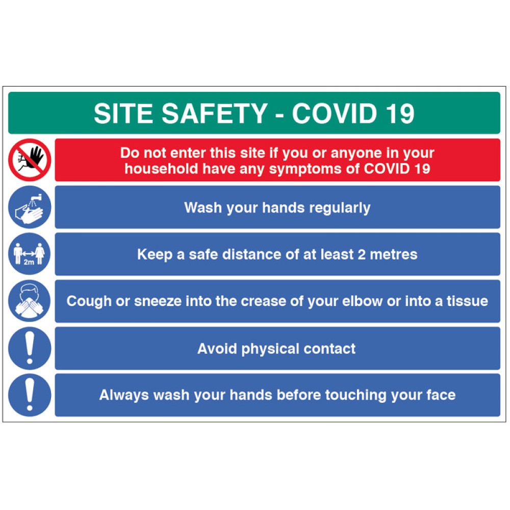 This COVID-19 site board says: Site Safety - COVID-19. Do not enter this site if you or anyone in your household have any symptoms of COVID-19. Wash your hands regularly. Keep a safe distance of at least 2 metres. Cough or sneeze into the crease of your elbow or into a tissue. Avoid physical contact.Always wash your hands before touching your face.