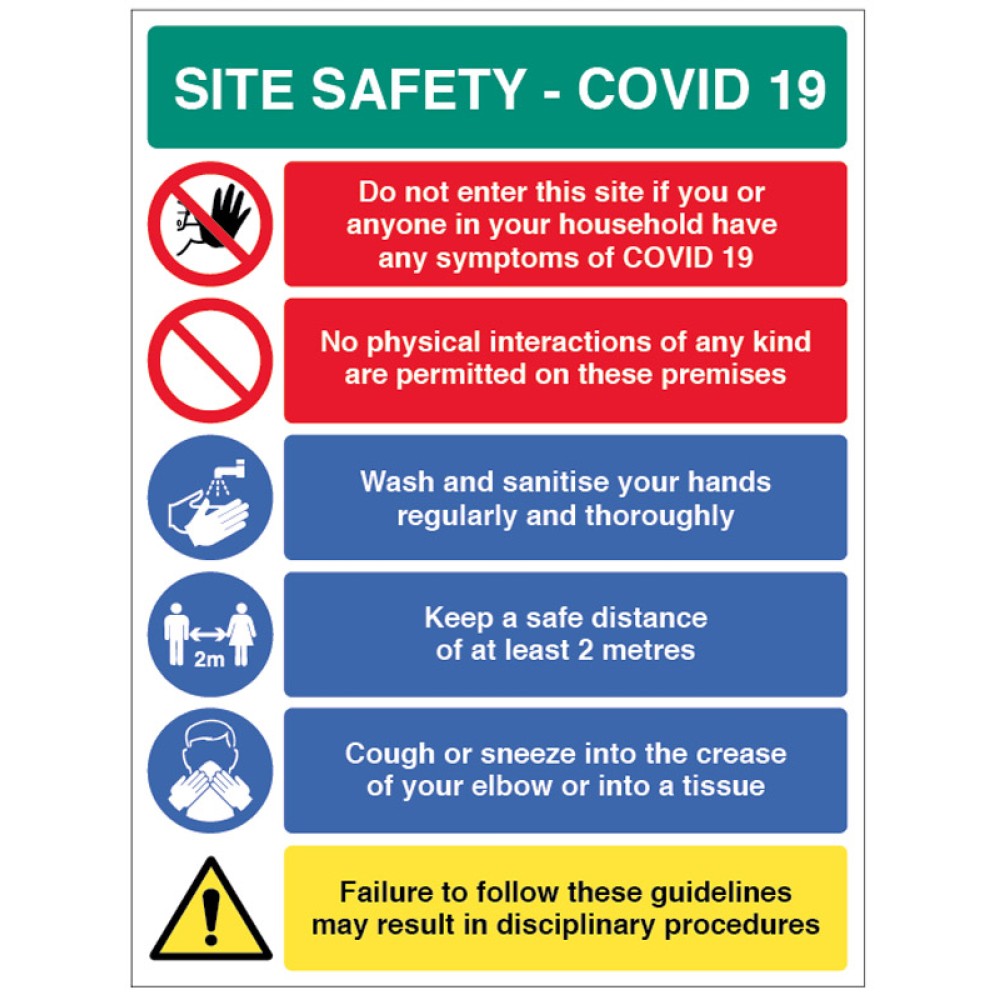 This COVID-19 site board says: Site Safety - COVID-19. Do not enter this site if you or anyone in your household have any symptoms of COVID-19. No physical interactions of any kind are permitted on these premises. Wash and sanitise your hands regularly and thoroughly. Keep a safe distance of at least 2 metres. Cough or sneeze into the crease of your elbow or into a tissue. Failure to follow these guidelines may result in disciplinary procedures.
