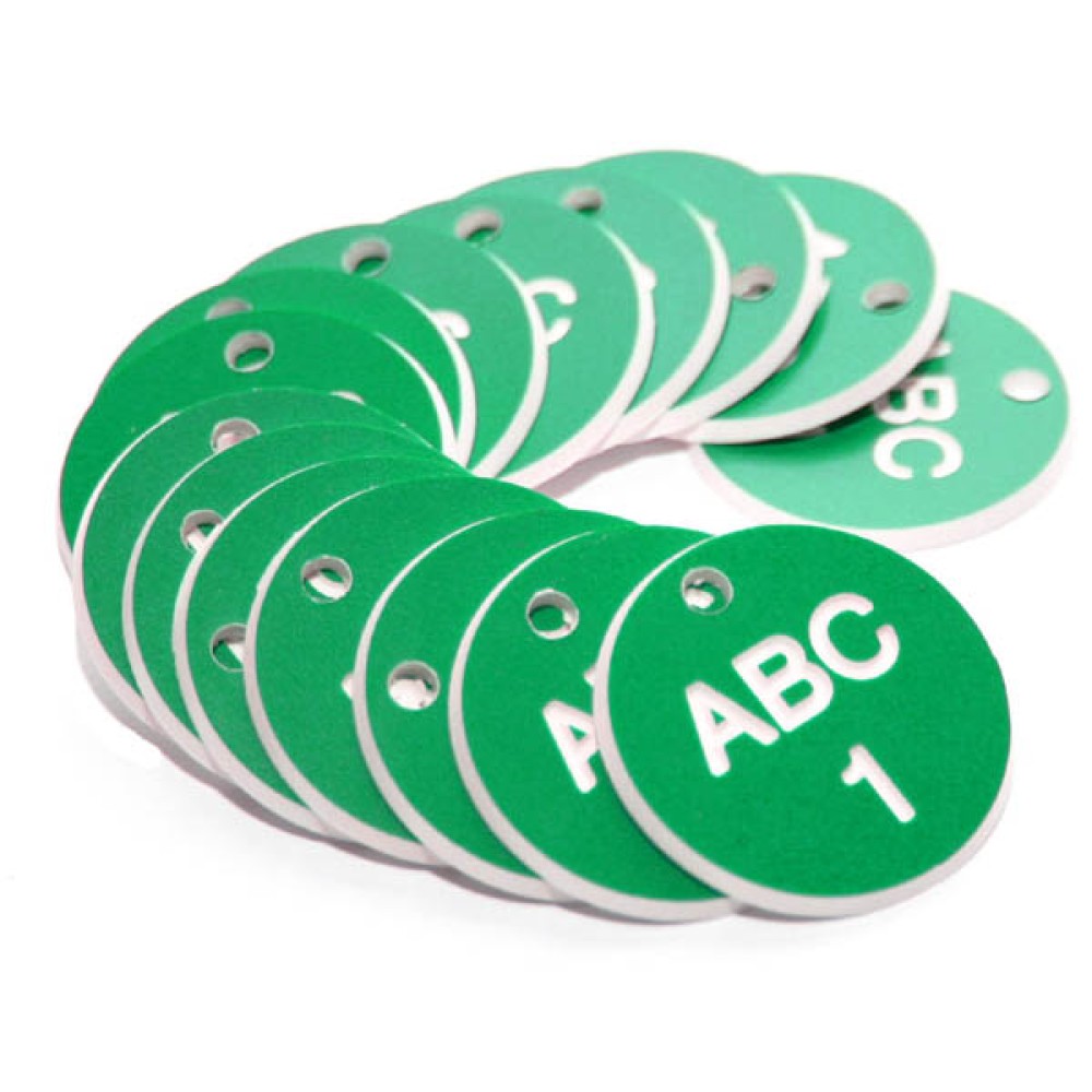 A green circular tag with bright white text, available in two different sises with the option of with or without prefixes. A cost effective and practical solution for many industrial applications due to being made of a heat-resistant and robust material able to withstand the toughest environments