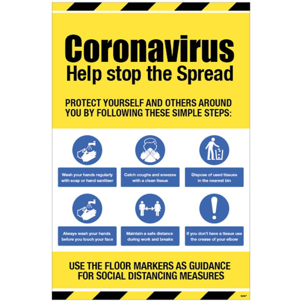Ensure customers, staff and visitors are aware of Coronavirus social distancing procedures with this eye catching sign. The sign states: Social distancing. Help stop the spread. Protect yourself and others around you by following these simple steps: Wash your hands regularly with soap and warm water. Catch coughs and sneezes with a clean tissue. Dispose of used tissues in your nearest bin. Always wash your hands before you touch your face. Maintain a safe distance during work and breaks. If you don't have a tissue use the crease of your arm. Use the floor markers as guidance for social distancing measures