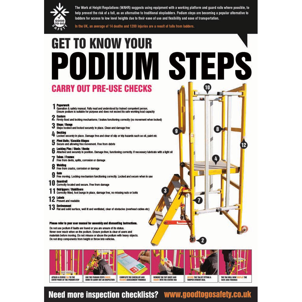 This podium step safety poster has been designed to reinforce the importance of completing pre-use podium step inspections and is the perfect accessories to our Good to Go Safety podium step inspection system.