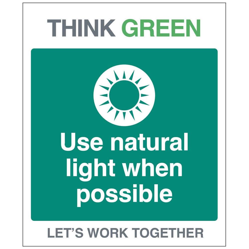 There are many reasons to conserve energy. Electricity and heat production is the largest contributor to global emissions and has staggering wastage percentages. With this sign you can promote awareness and remind viewers to use natural light whenever possible, this in turn will reduce energy usage, the first step to reducing pollution, adopting sustainable practices. Thinking Green can ensure the delicate balance of our environment is restored.