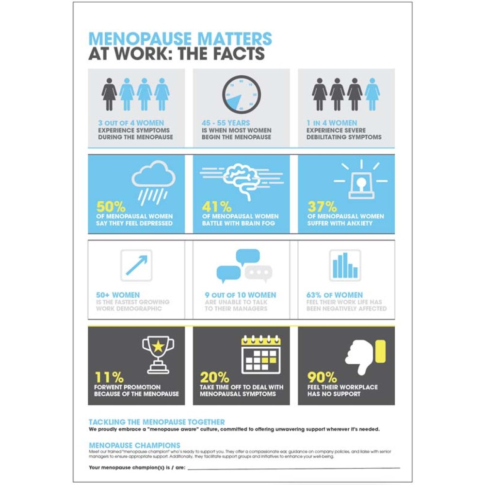 This health and well being poster provides key statistics in order to help all viewers embrace a "menopause aware" culture, This poster helps reshape our perceptions and actions surrounding the menopause. By displaying this poster in communal areas such as staff rooms, waiting rooms or open plan office spaces you'll show your company is dedicated to making thoughtful adjustments and striving to eliminate or alleviate the impact of menopausal symptoms in the workplace.