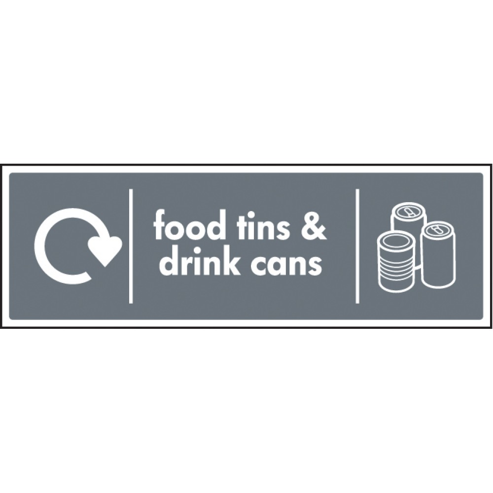 Recycling food tins and drink cans conserves natural resources by reducing the need for new metal extraction, lowers energy consumption, and minimises waste sent to landfills. The sign supports compliance with WRAP (Waste & Resources Action Programme) guidelines, assisting organisations in meeting their environmental and sustainability targets.