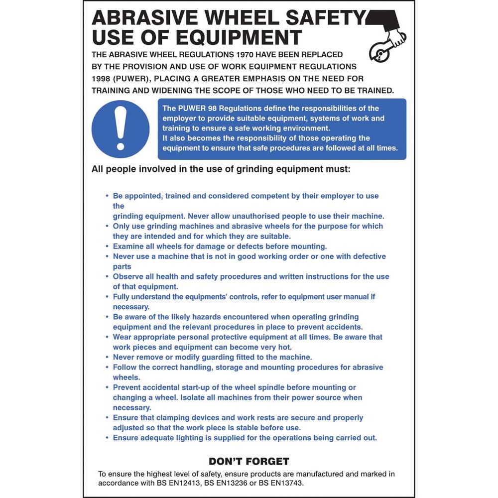 This safety poster covers essential information and advice relating to Abrasive Wheel Groups and best working practices