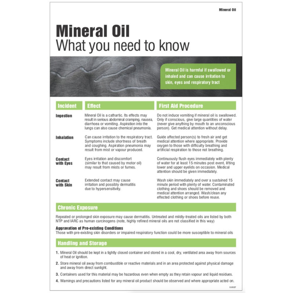 Handling and Storage: Mineral Oil should be kept in a tightly closed container and stored in a cool, dry, ventilated area away from sources of heat or ignition. Store mineral oil away from combustible or reactive materials and in an area protected against physical damage and away from direct sunlight. Containers used for this material may be hazardous even when empty as they retain vapor and liquid residues. Warnings and precautions listed for any mineral oil product should be observed and where appropriate acted on.