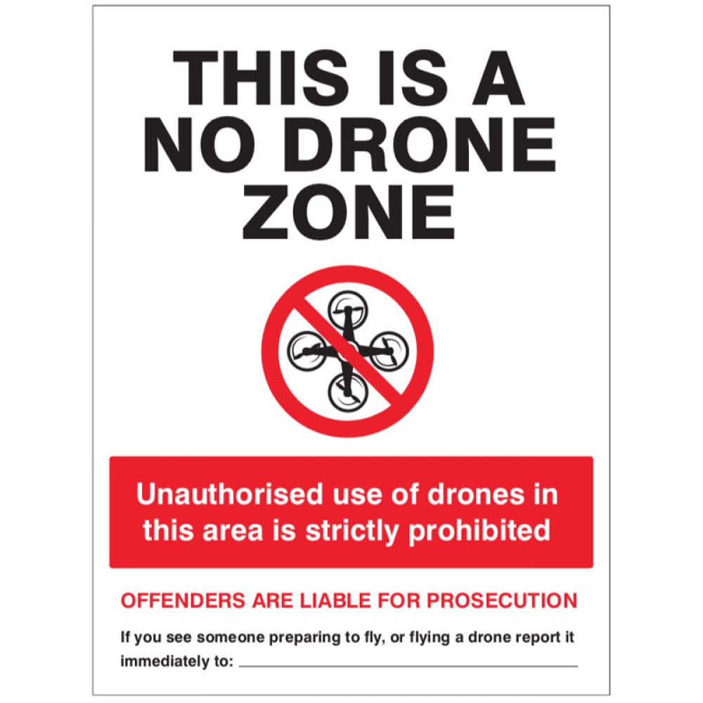 This prohibition sign highlights that the area is a No Drone Zone. Whether for privacy, security or safety this sign is idea to prohibit the use drones