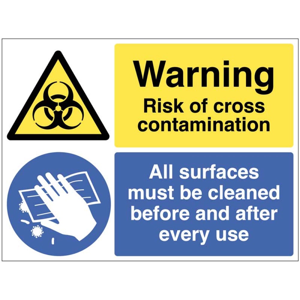 Sign says: Warning, Risk of cross contamination. All surfaces must be cleaned before and after every use